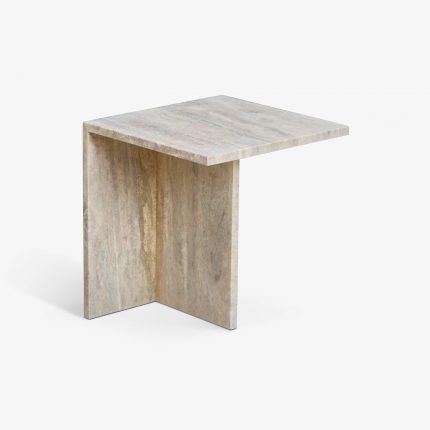 Tavoline Anesore Përmasa: 30x40x53cm. Materiali: Gur travertin autentik me teksturë unike dhe natyrale. Dizajni: Minimalist dhe elegant, me linja të