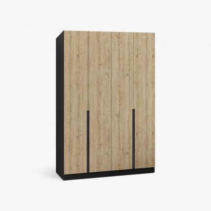 Dollap Përmasa: 180x60x240cm.  Dizajni: Katër dyer me mekanizëm mbylljeje të butë dhe doreza  në ngjyrë të zezë, bazament i ngritur