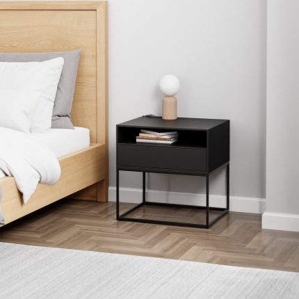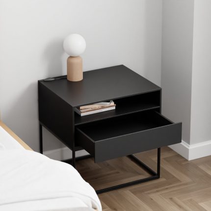 Komodin– Përmasa: 55x40x50cm.  Dizajni: Minimalist dhe funksional, me dy sirtarë me mekanizëm mbylljeje të bute. Prodhimi: Me porosi, deri në