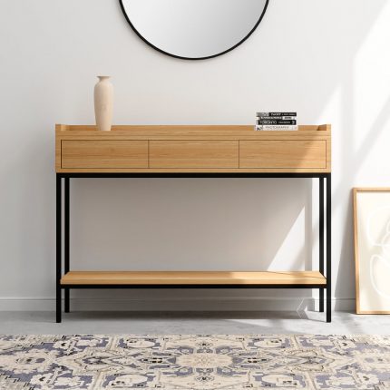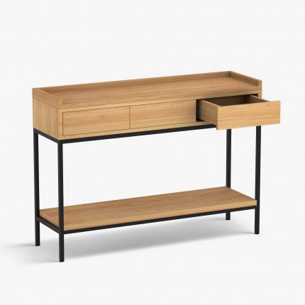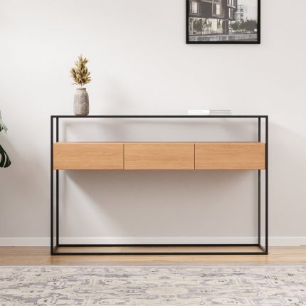 Përmasa: 90x50x42cm. Mobilie: MDF i veshur me furnir lisi natyral. Struktura: Metalike, e lyer me bojë pluhur të zezë. Shtresë