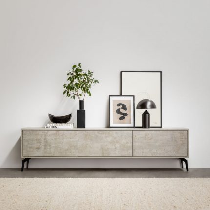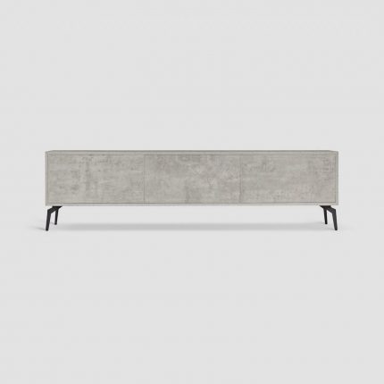 Përmasa: 180x40x52cm. Materiali: Melamine me efekt betoni industrial. Struktura: Këmbë metalike në ngjyrë të zezë me bazamente silikoni të rregullueshme.